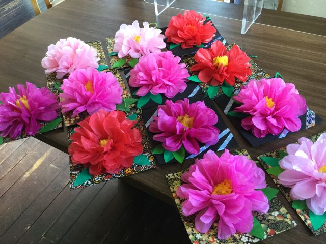 ボタンの花はお花紙を使って作りました。皆様、頑張ってお花紙を綺麗に整えていましたよ!台紙に花を貼り付けて、葉っぱも付ければ完成です。