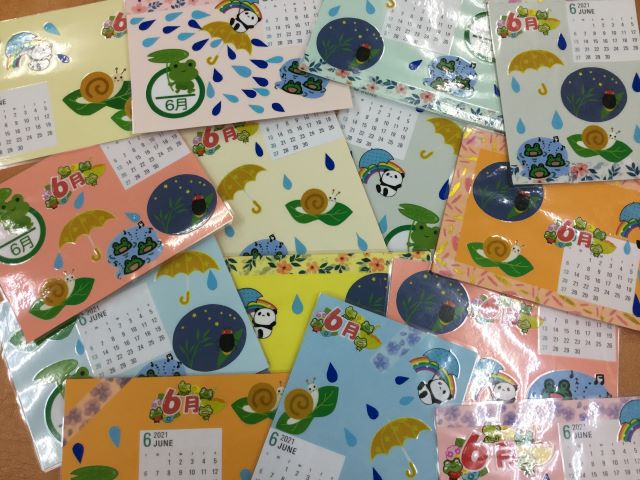 ミニカレンダー、6月用は梅雨をテーマにした絵柄です。カエルさんが沢山で可愛いですね。