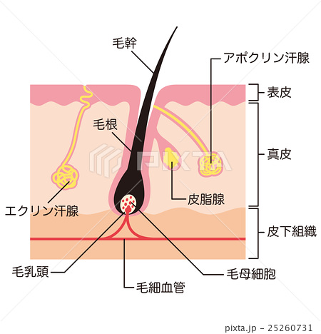 2 アポクリン腺・・・わきの下、陰部付近などの毛穴に汗を出す。