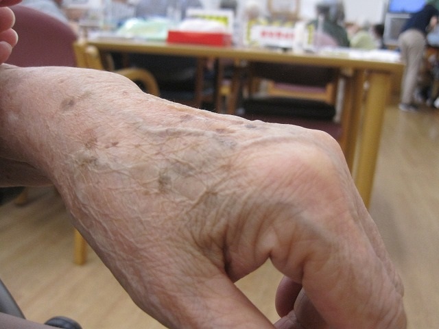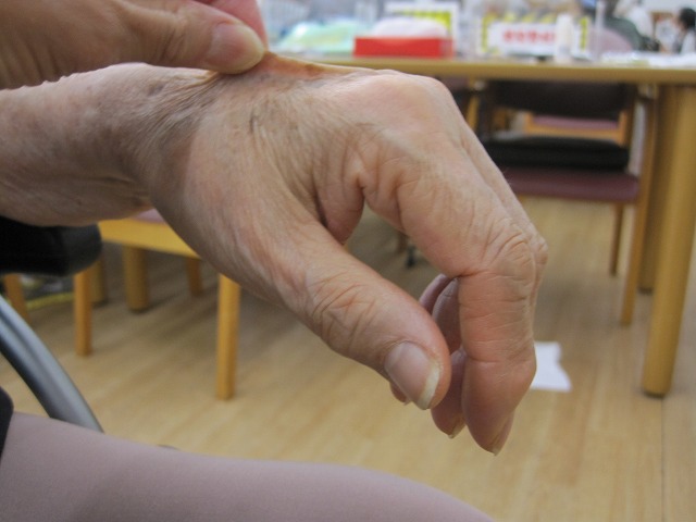 (つまんだ皮膚が戻りにくい)脱水状態になると皮膚の弾力が失われます。手の甲の皮膚を指でつまんで放し、3秒以上戻らなかったら脱水症の疑いがあります。