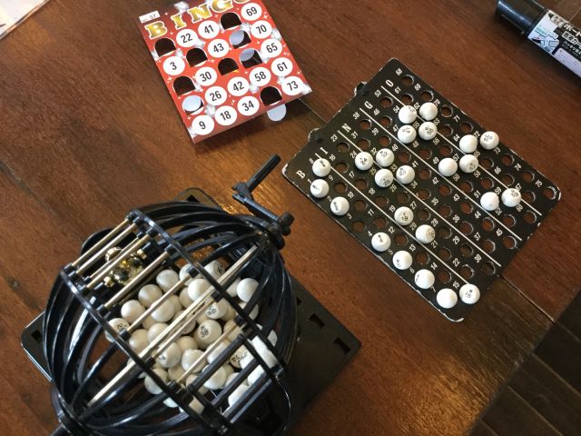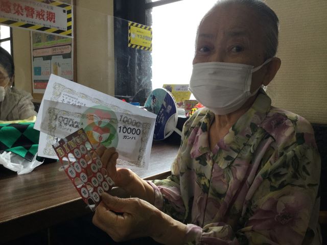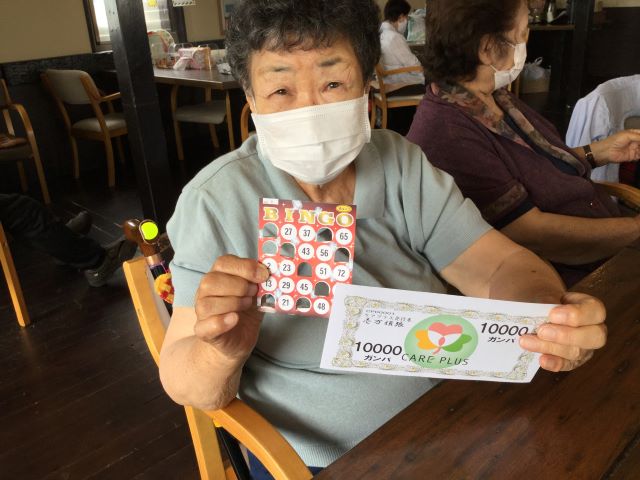 続いて、毎度大盛り上がりのビンゴ大会。6月は3回行われました。6月9日は『ロックの日BINGO』13日は『FMの日BINGO』22日は『ボウリングの日BINGO』でした。数字が読み上げられると「無いぞー」「何番と何番を出して」とビンゴ大会恒例の声が上がり、皆様真剣にビンゴカードの数字を探していました。同率の方が多数で混戦状態になり、多くの方が高額ガンバを手にする展開になった回や最初の10個数字が読み上げれても1つも数字が無い!ということで稀なボーナスガンバを獲得し最終順位は低かったものの高額ガンバを得た利用者様がいた回など毎回様々なドラマが起こるビンゴ大会となりました。