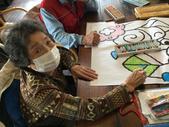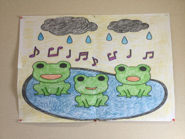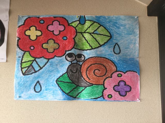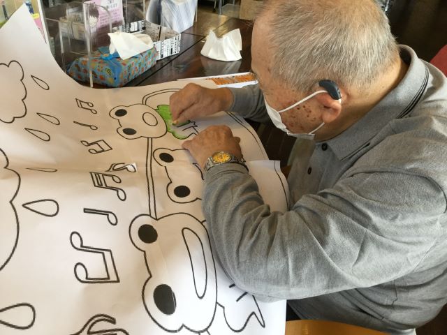 塗り絵大会では6月らしい紫陽花やカエルの絵柄でフロアの壁に貼る大型の塗り絵を協力して塗っていきました。「カタツムリは何色がいいんかわからんな」「カタツムリはこの色よ」と、利用者様同士塗る色を相談し合ったり、紫陽花や梅雨に関する話で盛り上がったりしました。