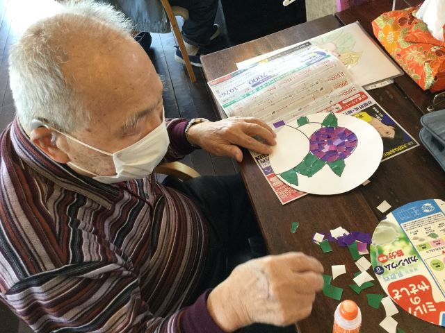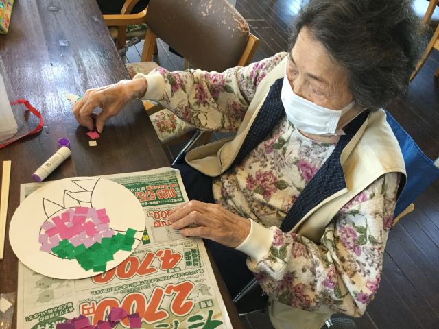 葉っぱの端まで細かくちぎって丁寧に貼っている方や貼り絵に一工夫加えてオリジナルのうちわを作っている方もいらっしゃいました。色合いもさまざまな個性豊かな手作りうちわが完成しました。「きれいに作っとるね~」と、利用者様同士作品を褒め合う様子も見られました。