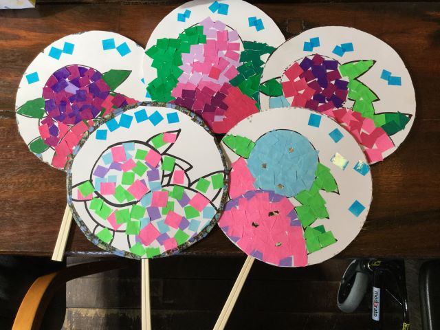 日曜日の作業レクでは、手作りうちわの作成と塗り絵大会を行いました。手作りうちわは牛乳パックと割り箸で作り絵柄は折り紙で紫陽花の形に貼り絵をしていきました。