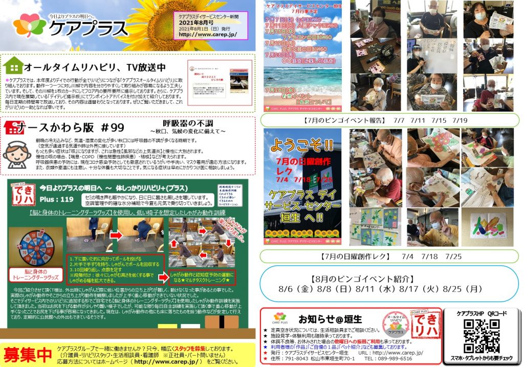 ケアプラス垣生新聞 2021年8月号が更新されました。