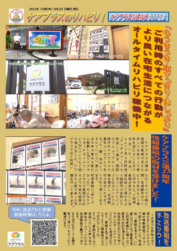 7月号でも告知させて頂きましたケアプラス三津が情報番組グッチョイで紹介されました。放送後、「番組を見たよ、いい感じだった」など番組を見た利用者様から様々なご意見や反応を頂きました。放送内容の中には今年イチオシのオールタイムリハビリについても放送されており、番組を見て頂くことでよりご理解頂けるのではないでしょうか。