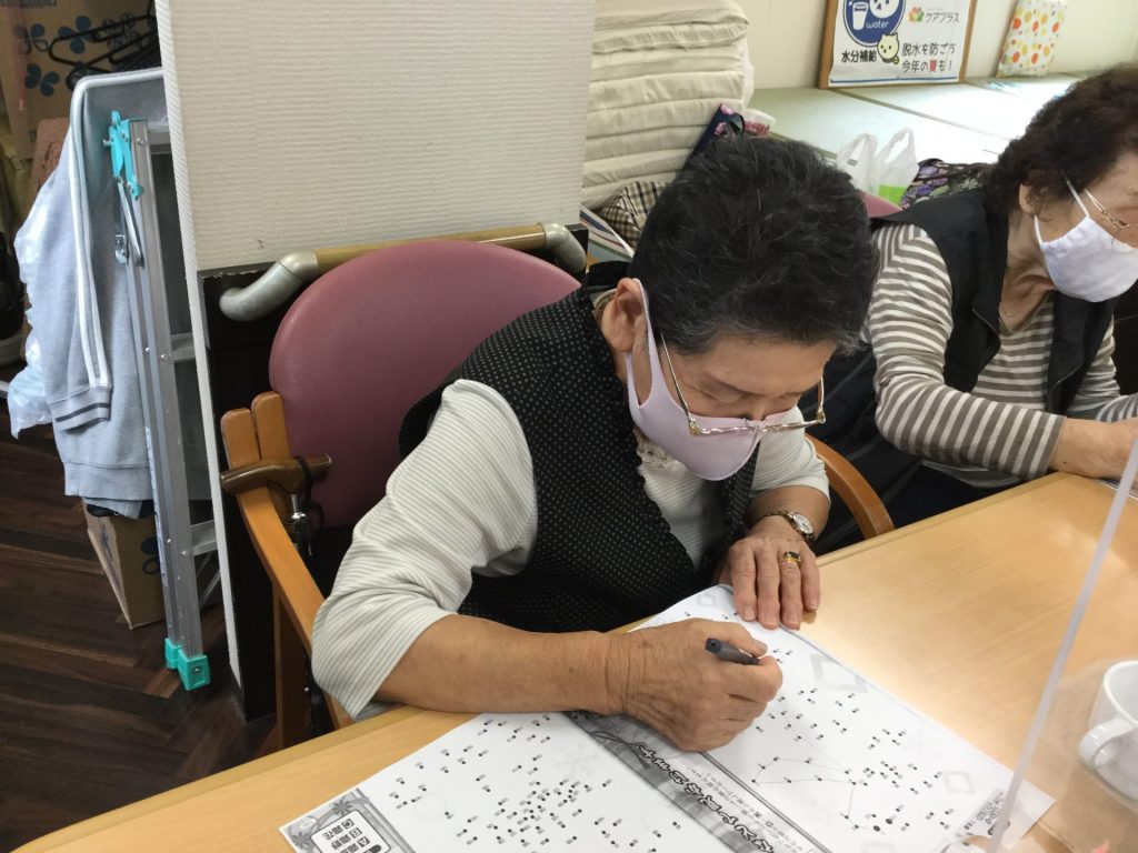 バイタル測定が終わり、リハビリやお風呂に行かれる方様々ですが、席に着かれている方々も沢山いらっしゃいます。その方々には脳トレ等のプリントを配布しております。点つなぎ、間違い探し、計算問題、漢字問題など色々なプリントを用意し、ご利用者様に好きなプリントを選んで頂いています。