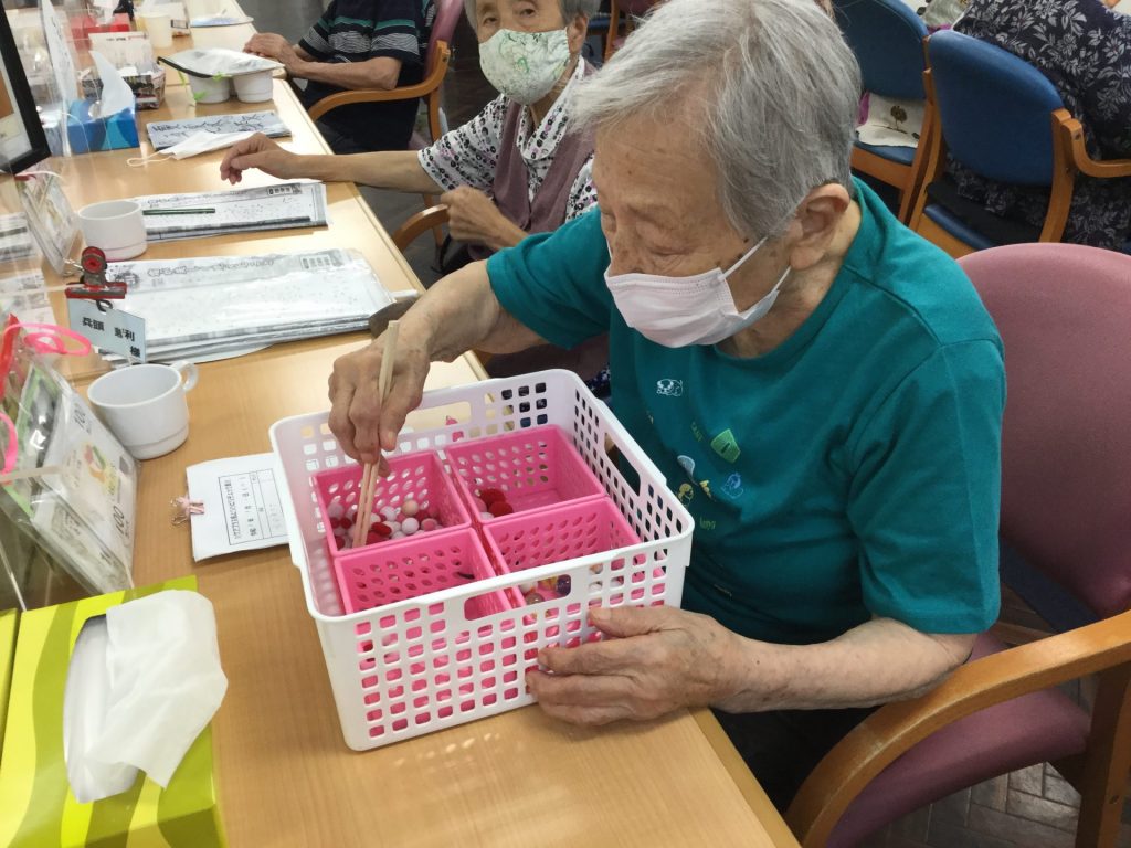 指先の運動にと洗濯バサミ玉掴み等のリハビリ道具もご用意させて頂いております。