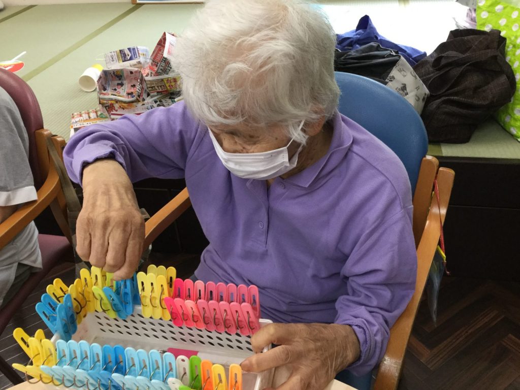 洗濯バサミは「数が多いから最後の方は手が疲れるね」と言われるご利用者様もおられますが、お話をされながら、最後まで頑張っておられました。
