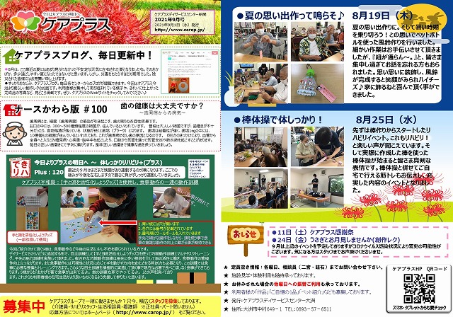 これから季節の変わり目となりますので、ご利用者様の体調に気を付けながら、また今月も楽しい時間を皆様と過ごしていければと思います。