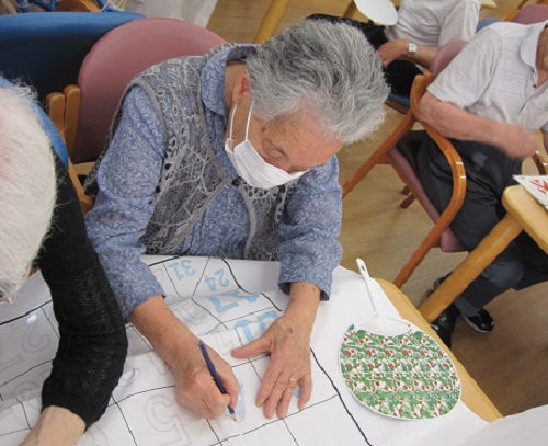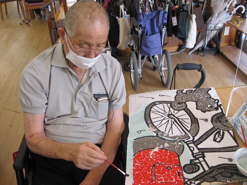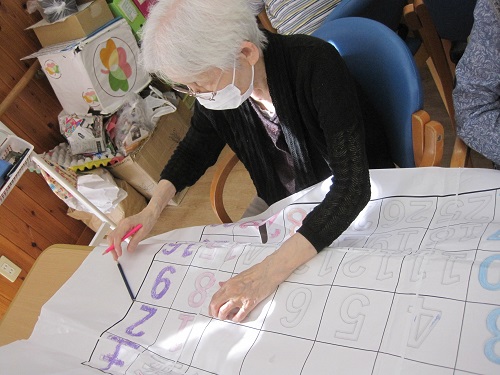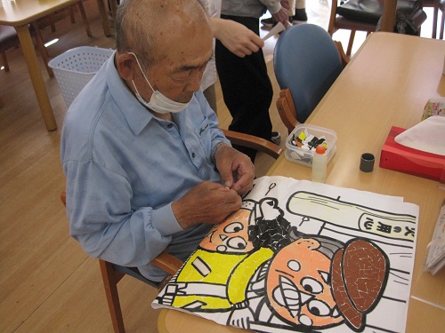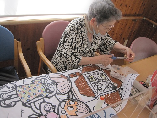 10月は子供たちに紙芝居をしている様子の絵をちぎり絵カレンダーにして制作中です。「昔はよう紙芝居の人が来て、してくれよった。」と思い出話に花を咲かせながら、折り紙を貼って頂いております。