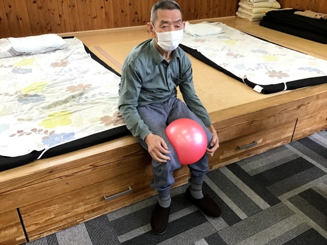 立ち上がりの際に膝が外を向いていることが多い為、ボールを挟んで大腿内転筋の筋力トレーニングを行います。