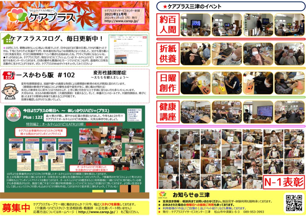 ケアプラス三津の大人気イベントの「N-1ぐらんぷり」は投票結果が出揃い、表彰式を開催しました。この時のみなさんの笑顔や選ばれたことに対してビックリした表情はきっと次へのモチベーションに繋がると思います。そして、第5回N-1グランプリは11月から開催されます!もうみなさん早々と色鉛筆片手に手ぐすねを引いています。果たして、今回はどのようなドラマが生まれるか・・・楽しみですね♪