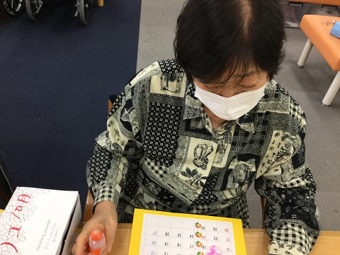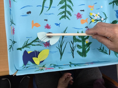 こちらは磁石に魚がつく作りになっておりまして、一列で行うゲームとなっており、5匹釣れたら後ろの人に回すといったルールになっております。「これは面白い、」と言われており、楽しまれているご様子でした。私も「慎重に落とさないよう釣り上げていってくださいね!」と言ったら、利用者様は「はいよー釣るでー」と言われておりました。