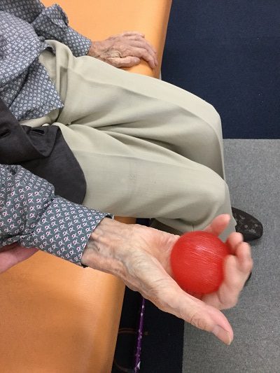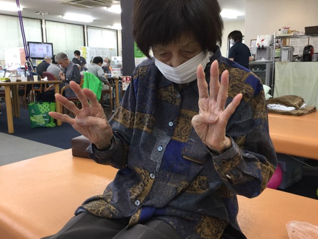 写真3.4に関しては手全体の筋力向上ために手を力強く握って頂いたり、ご自宅リハビリパックのゴムボールでご自宅でも手の訓練を継続して頂いたりしました。