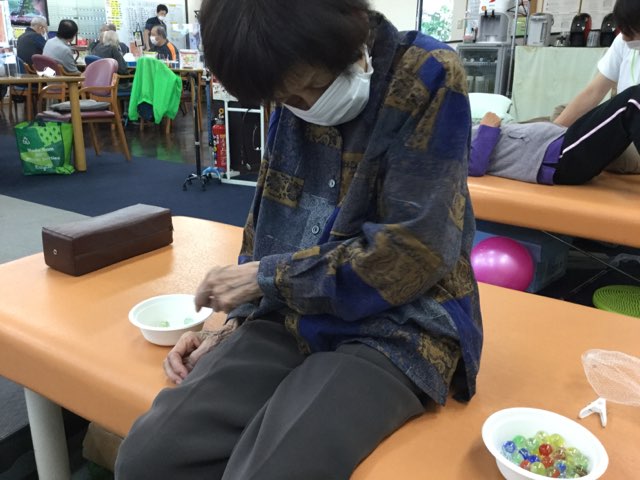 写真1.2に関しては手指の巧緻性を獲得するために指数え、各種手指ごとにつまみ動作を行いビー玉を運んで頂きました。
