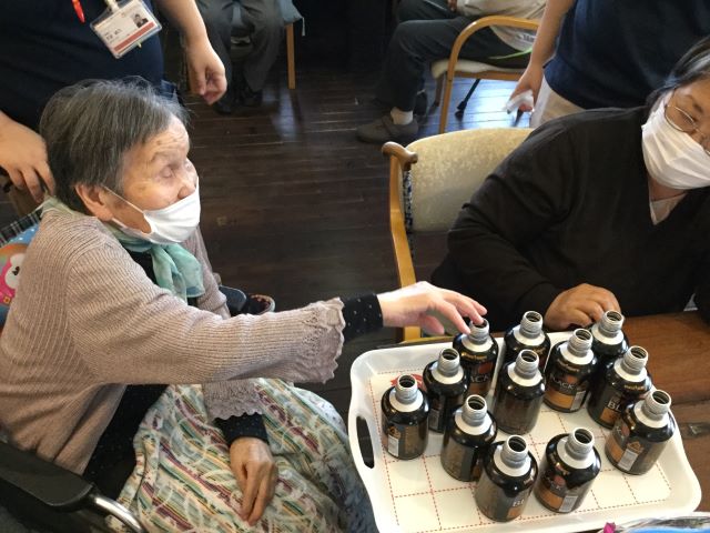 じゃんけんで勝った方から空き缶を引いていただくのですが、このゲームは後から缶を引いた方が有利ですよね。先に紹介した『倒しちゃダメ…』のゲームと逆。じゃんけんが強いだけではダメですよ、という事です。空き缶の底の絵柄で「ネコはどこやった?」「ケアプラスマーク、さっきあったなぁ!」と皆様、記憶をフル回転させて挑まれていました。
