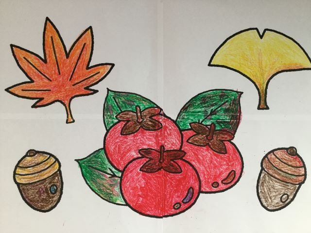 次は利用者様方の作業レクでの作品を紹介します。まずは貼り絵。先月の貼り絵はこちらの素敵な作品です。秋ですねぇ。