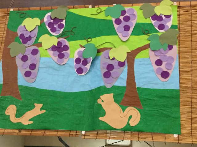 秋の果物といえばリンゴもそうですよね。という事で、リンゴのモールを作成していただきました。皆様、頑張って両面テープでリンゴを立体的に作成されていました。