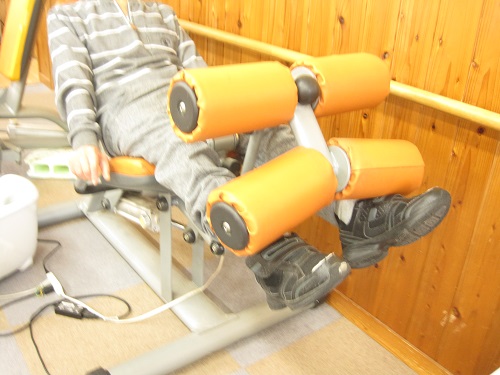 そしてパワーリハビリの方では、重りを両足で持ち上げ、ふくらはぎや太ももを鍛えておられます。重さ等、その方に合わせて行っていただいてます。