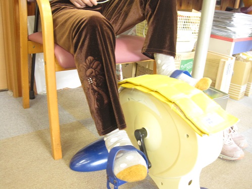 ミニバイクのペダルを漕ぎ、下肢筋力強化で足を鍛えておられます。
