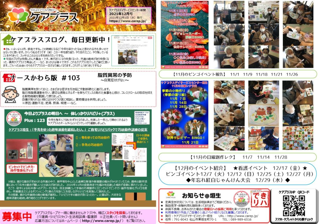 さて、ケアプラス垣生新聞12月号が発行されました。
