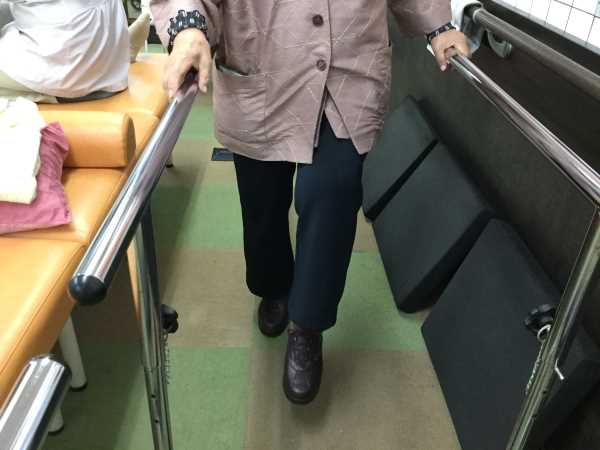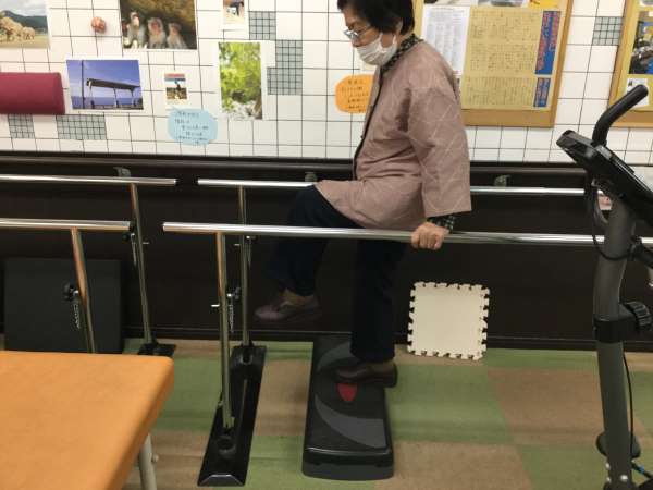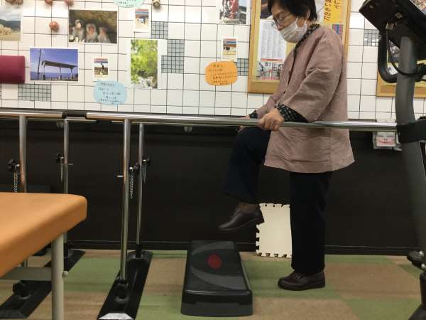 安定した歩行ができるように、まずはリハビリ室にある平行棒と昇降台を使って足を上げる動作訓練を提案させて頂きました。