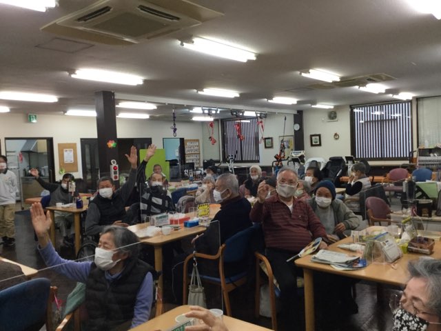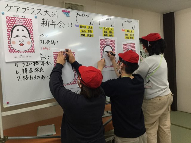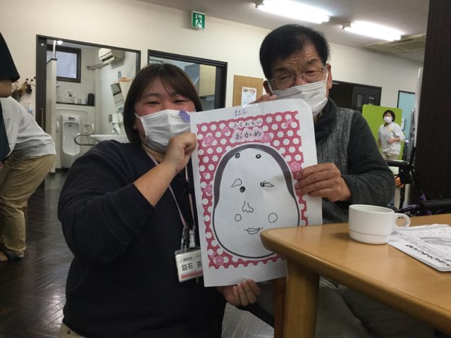 うまい棒の早食い競争では最初は各職員が競争し、その後は二人羽織で各チームのキャプテンが競争を行いました。「まだまだ食べられるよ!頑張れ!!」とご利用者様の声援を受けて、次から次へとうまい棒を口にしておりました。福笑い、早食い競争、輪っか送りとどの種目も笑いに包まれ、ご利用者様からは「今日は初笑いやね。楽しかったよ。またやってね。」ととても喜んで頂き嬉しく思いました。