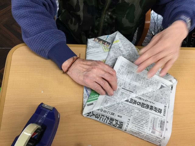まず初めにゴミ箱作りに励むご利用者様についてです。ご利用日にはご自分のテープ、のり等をご用意されており、ケアプラスに到着され落ち着かれると職員に「新聞紙持ってきてや。今日はどのゴミ箱を作ろう?」と声を掛けられます。ゴミ箱用のゴミ入れ、机上用のゴミ箱、両方作られる為、「今日はこっちにして下さいね」と声を掛けると器用に新聞紙を折り作られます。この日は、ゴミ箱の中に入れるゴミ入れようです。