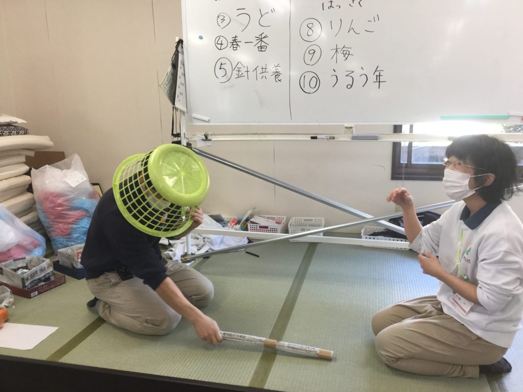 また、休憩も兼ねて職員による『叩いてかぶってジャンケンポン♪』を開催しました。その名の通り、ジャンケンで勝った職員は新聞棒で叩き、負けた職員は阻止するためにカゴをかぶります。