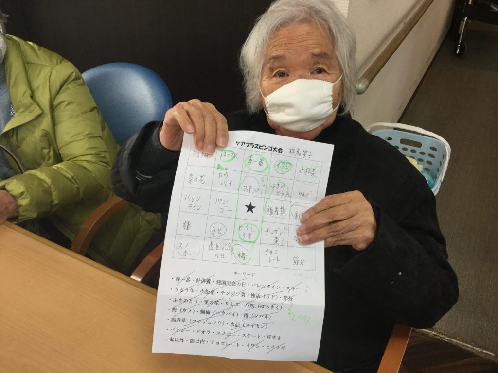 参加されるご利用者様には阿讃生送迎が終わりリハビリの合間や入浴の合間などにビンゴ用紙に記入をお願いしました。記入して頂く言葉の中には春に関する言葉が多くあり、「ロウバイ」「ビオラ」などがあり、記入しながら「これ何?花の名前かな」などお話をされながら記入されていました。ビンゴが始まると「あー、全然揃わん」「次これが来たらリーチなんだけど」「やった。私終わったよ」と嬉しそうにビンゴ用紙を見せて頂きました。
