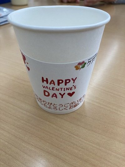 午後のティータイムに紙コップでコーヒーやジュースを提供させて頂くのですが、ひと手間掛けバレンタインデー仕様に。
