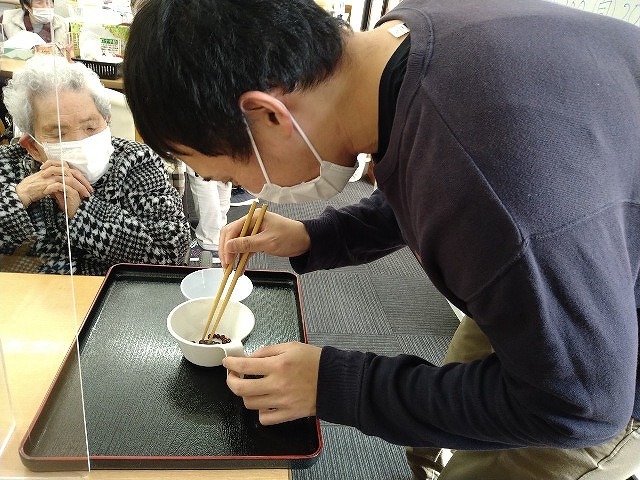 スタッフには小豆と箸で挑戦してもらいましたがこちらは小さいのでなかなか悪戦苦闘していましたね(笑)