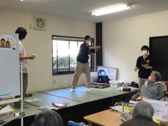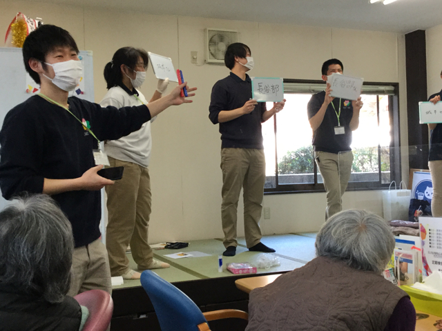 ということで職員によるジェスチャー当てゲームです。職員が何をしているのか当てて頂きます。当たればポイントがもらえポイントに応じて飾りがもらえるということで皆さん真剣です。