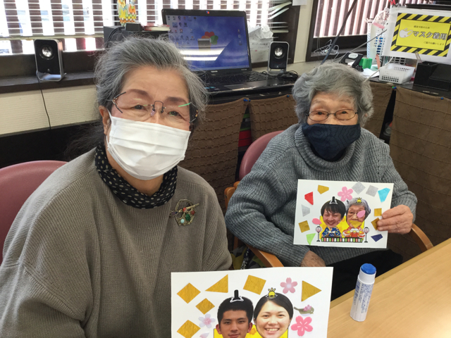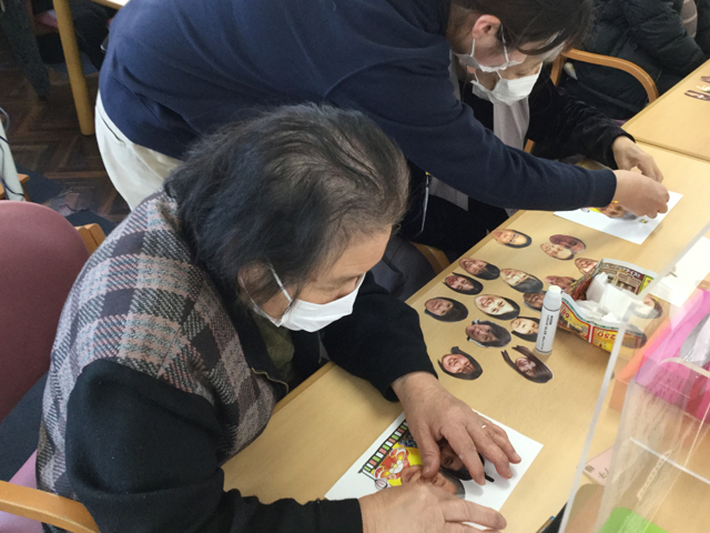 3月3日はお雛様ということで、この日は皆でお雛様作りです。当日までにこの日のご利用者様の写真を撮り顔をコピーしておきました。ご利用者様の隣には職員の男雛、女雛です。白い画用紙に着物を着た顔のない男雛、女雛にご自身の顔を貼っていきます。「私、若い男雛がいいな」「この職員の人着物が似合いそう」と話しながらペアを決められていました。