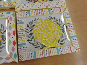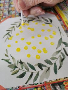 ミモザのお花の部分を作っていきます。今回は綿棒でポンポンしていきます。利用者様から「綿棒の使い方が斬新で面白い」「綺麗にポンポンできたでしょ」とワクワクお話し頂きました。「こんなに簡単にできたのにすごく華やか」「飾るのが今の時点で楽しみ」と完成を心待ちに作っていきます。