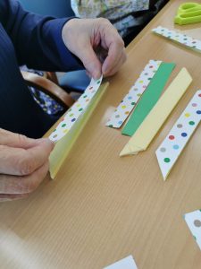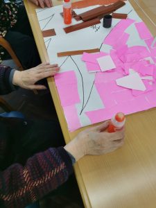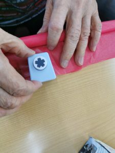 春らしい色の紙を桜型に切り取っていきます。「毎年送迎の車の中から桜を見るのが好き」「お花見は道後公園に毎年行くん」とお花見のお話しをされながら楽しく作っていきます。