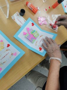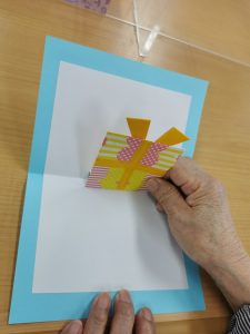 折り紙をカードに貼り付けていきます。飛び出すカードなので貼る場所に気を付けながら貼っていきます。「今の時点で可愛いから完成も可愛いと思う」とお話しされ和気あいあいとした雰囲気で作っております。