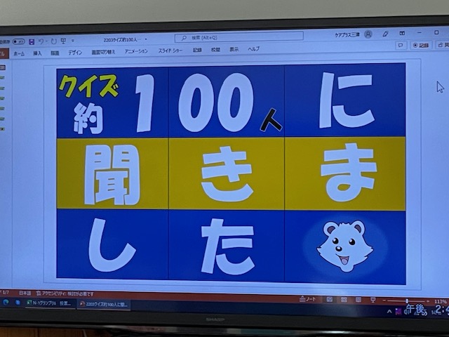 さてケアプラス三津では3月25日に第2回『クイズ約100人に聞きました』のイベントが開催されました。前回は9月に開催しており秋に因んだ問題が出題されていましたが、今回は春の開催という事で「春の食べ物といえば?」「春の花といえば?」「春の催し物といえば?」といった春に因んだアンケートを全利用者様にお聞きし、集計結果を問題化しました。