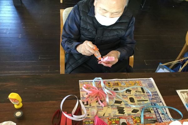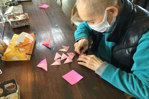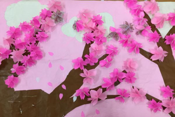 季節の貼り絵では、桜の木を制作しました。各工程を利用者様同士が役割分担してたくさんの桜の花を折り紙で作っていただき貼っていきました。