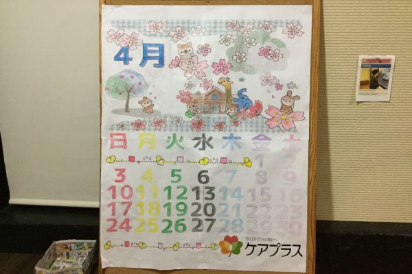 月のカレンダーでは、たくさんの利用者様が少しずつ協力して塗り、4月のカレンダーを作りました。