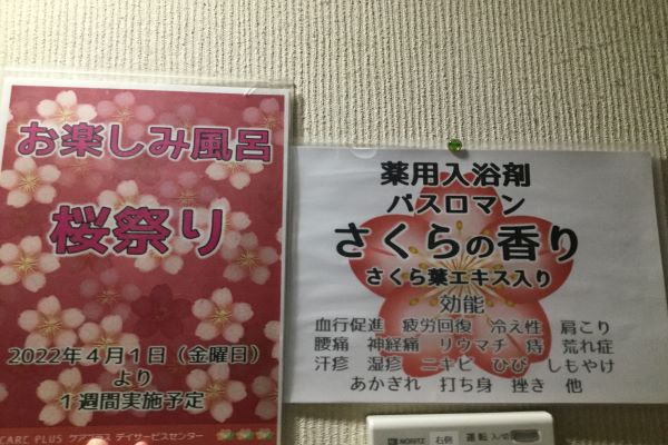 また、4月1日から桜祭りとして桜の香りの入浴剤を入れたお楽しみ風呂を行っています。薄ピンク色のお湯に桜の香りに利用者様から「お弁当持ってお花見が出来ないから気分を味わえて嬉しい。」、「最近俳句詠む気力が無くなっていたけど、桜の香りを嗅いでやる気が出たから帰ったら詠んでみる!」 と数々の嬉しい言葉を頂きました。