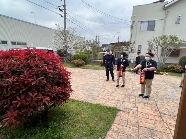 職員数名は恒例の消火器の練習に移りました。退院の方から使い方を一通り教えて頂き庭の木を火元に見立てて実践をしました。