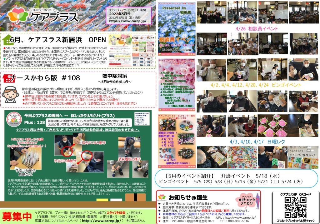 それではケアプラス垣生新聞5月号を紹介します。4月は「週刊誌の日」や「あんぱんの日」など合計5回ビンゴイベントがありました。毎回ビンゴの日は利用者様が楽しみにされており一喜一憂される方もいらっしゃいますが、かなり盛り上がります。26日には相談員イベントが開催され相談員3人仮装し、昭和、平成、令和に起こった事柄のクイズ大会でこれも盛り上がり利用者様から「楽しかったよ~」と感想がありました。詳細は、相談員のブログをご覧頂ければと思います。入浴の際は桜や森林の入浴剤を入れて楽しんでおられました。