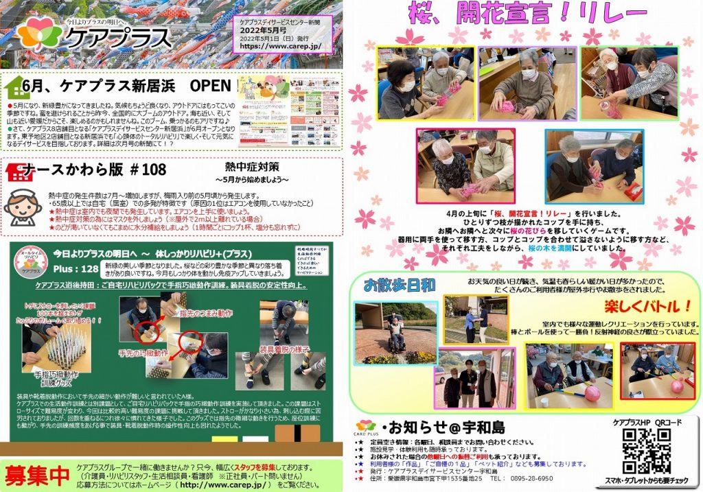 先月は桜が満開に咲き、ケアプラス宇和島も桜色に染まっていました。
