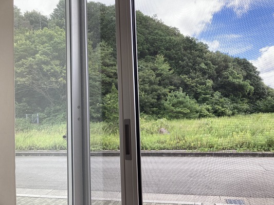 先ずは、窓を開けて温まった空気を外に逃がしましょう。ケアプラス宇和島の周りは自然に恵まれており、窓を開けると広い敷地の向こうには山が見えます。季節折々の木々も見え緑豊かな所です。