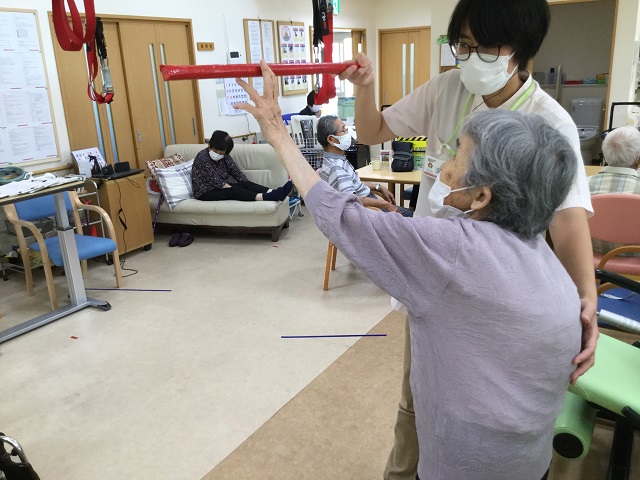 一対一で体操をしていると自然と2人、3人とご利用者様が集まって来られる事が多く、時には5~6名のご利用者様と一緒に棒体操を行っております。