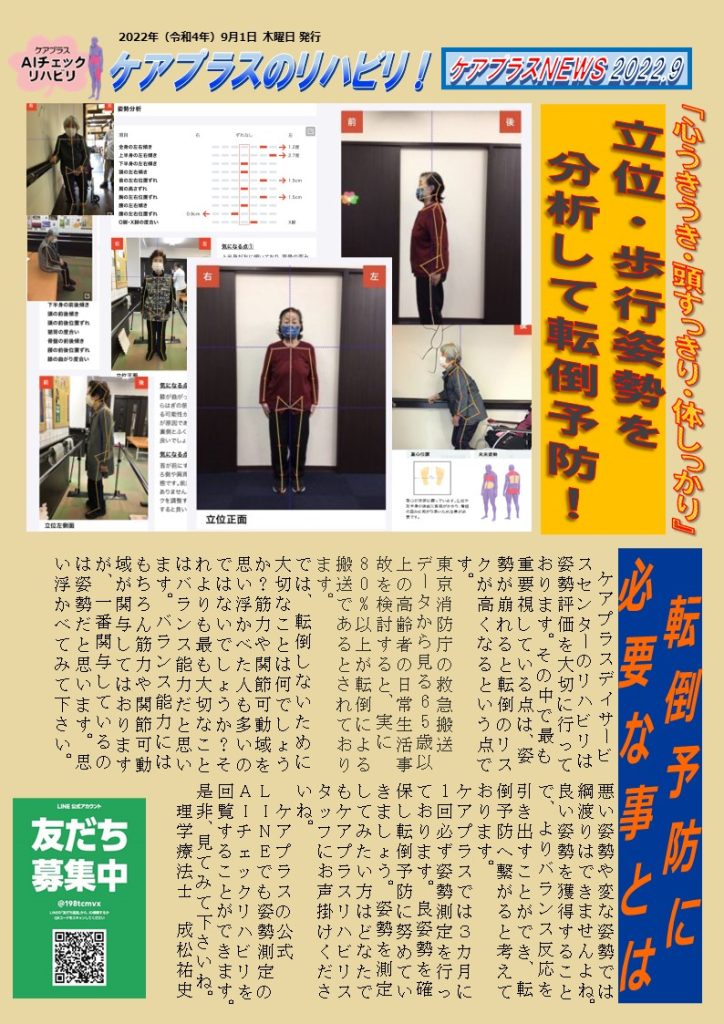 ケアプラスでは3カ月に1回必ず姿勢測定を行っております。良姿勢を確保し転倒予防に努めていきましょう。姿勢を測定してみたい方はどなたでもケアプラスリハビリスタッフにお声掛けくださいね。