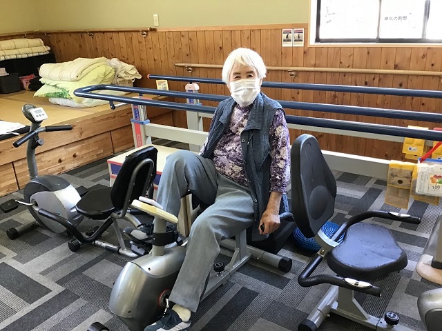 下肢筋力強化のためにエアロバイクエクササイズ。