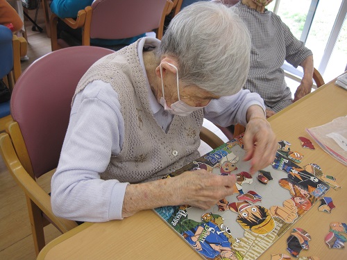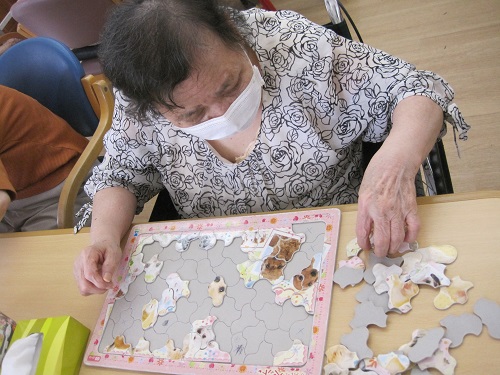 パズルは机の上で簡単に出来る脳トレです。大きいピースの物から細かいピースの物まで難易度がたくさんあるので、皆さんお好きなパズルで脳トレをしています。中にはお隣のお席の方と協力されて、談笑しながら楽しまれています。